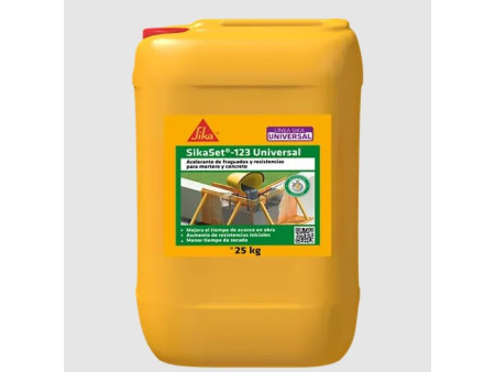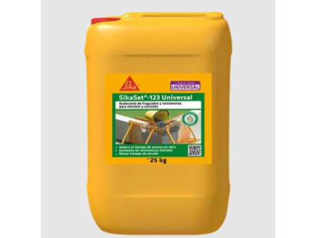 Acelerante de fraguados y resistencias para mortero y concreto. Aditivo líquido con acción acelerante sobre el fraguado (endurecimiento) y el desarrollo de resistencias mecánicas del mortero y el concreto a todas las edades (tempranas y finales). SikaSet®-123 Universal proporciona los siguientes beneficios tanto en el concreto fresco como en el concreto endurecido: Reduce los tiempos de desencofrado, Endurece más rápido el concreto, Se obtienen resistencias más altas a edad temprana.