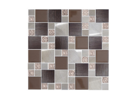 Mosaico en el que se mezcla el vidrio con efecto metalizado, contrastados con el acero inoxidable estructurado y cromo cepillado, ofreciendo un acabado brillante. Sus fichos cuadrados, dispuestos sobre una plantilla homogénea, de corte recto, logra balance gracias a la composición de sus fichos en tono cafe que la hace un diseño elegante, sutil y muy atemporal. Recuerda no retirar la película protectora del ficho metálico hasta finalizar la instalación. La variación de tono, espesor y tamaño es inherente al proceso de fabricación del mosaico.