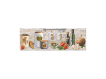 El listón Catania Olivas Corona para cocina en formato 15x45 con diseño inspirado en una alacena de fondo rústico tipo piedra con elementos básicos de cocina en versión multicolor donde priman los tonos neutros con toques de rojo y verde. Su acabado es mate pero se contrasta con toques de brillo y dorados. Tiene continuidad horizontal y se puede combinar con el listón Catania Kiwi en el mismo ambiente para dar mayor riqueza a la propuesta.