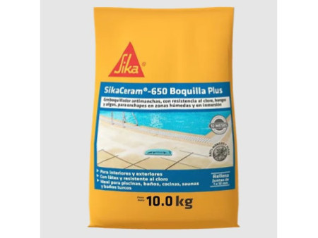 BOQUILLA/FRAGUA CON RESISTENCIA AL CLORO, HONGOS, ALGAS Y ANTIMANCHAS PARA ENCHAPES EN ZONAS HUMEDAS Y EN INMERSIÓN PISCINAS. SikaCeram® 650 Boquilla Plus es un mortero impermeable en color blanco mejorado con polímeros con cualidades antihongos, antimanchas y con resistencia al cloro. Ideal para emboquillar exteriores, zonas húmedas como cocinas, baños, saunas, turcos y piscinas. Presenta un alto desempeño a la abrasión y absorción de agua clasificada como CG2WA según la norma NTC6050-3.