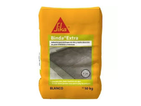 Sika® Binda® Extra es un adhesivo elaborado con base en cemento, de color blanco o gris, que mezclado con agua forma un material de pega con largo tiempo de manejabilidad y una gran capacidad de retención de agua. Para uso en pisos interiores y exteriores. Listo para usar, basta mezclarlo con agua, No se requiere saturar de agua las tabletas, Permite alistar grandes áreas para la pega de enchapes, Gran adherencia a los materiales de construcción, Economía por transporte y almacenamiento por su menor consumo.