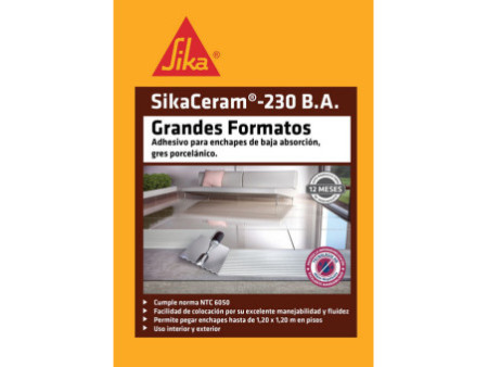 SikaCeram®-230 BA Grandes Formatos es un mortero de ligantes mixtos, especial en la instalación de piezas cerámicas de baja absorción mediante aplicación continua en capa delgada en pisos y muros interiores y pisos exteriores, especialmente formulado con aditivos especiales que le confieren una característica de protección adicional a la impermeabilización contra el paso del agua; de color blanco o gris.